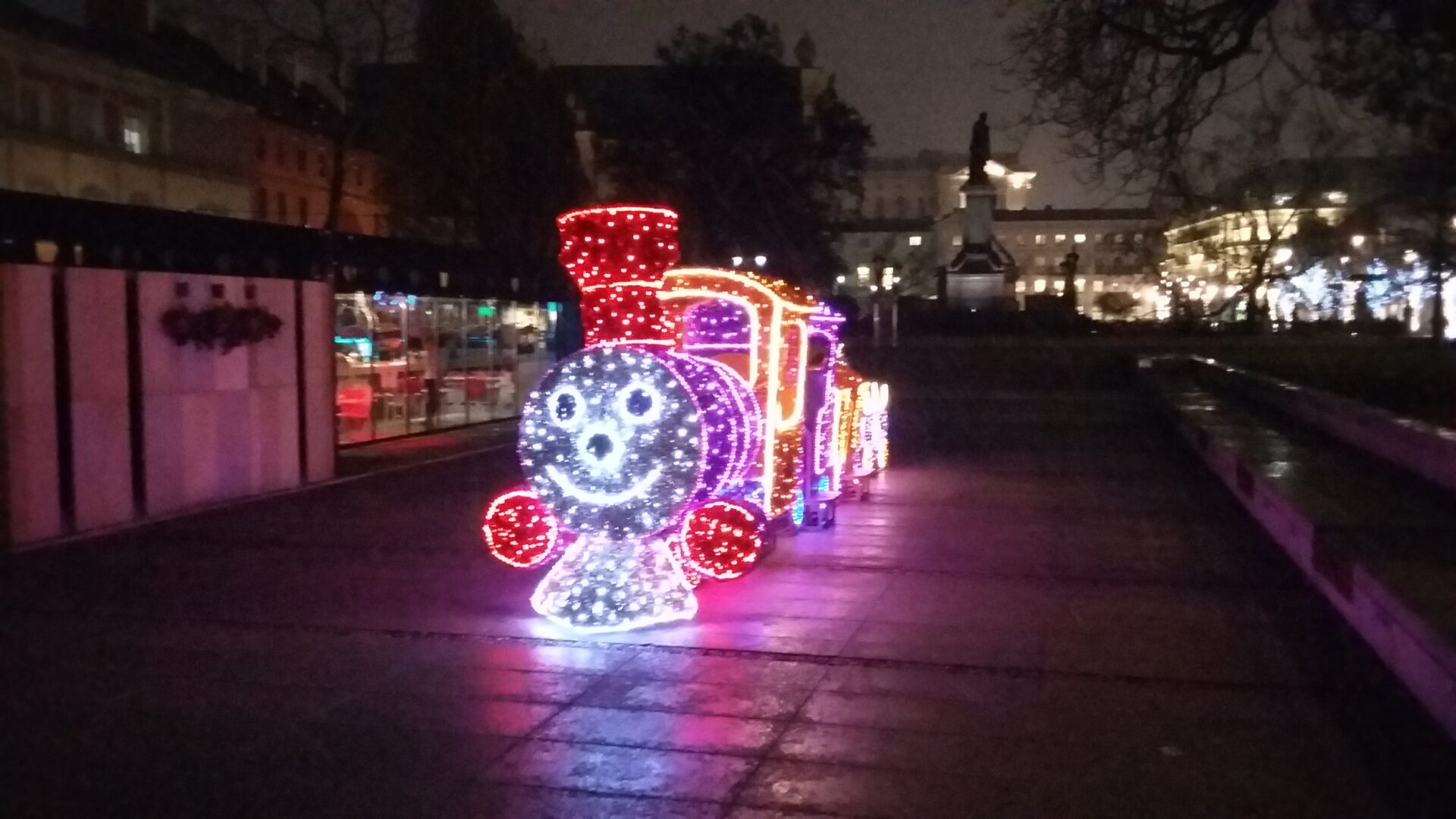 Besonders aufgefallen ist mir der Detailreichtum: wechselnde Farben, verschiedene Figuren und eine Weihnachtsmetro. Dazu ist für das leibliche Wohl gesorgt: Glühwein, heißes Bier, heiße Schokolade, gegrillter Gebirgskäse, Wurst in allen Variationen, süße Waffeln, gebrannte Mandeln…